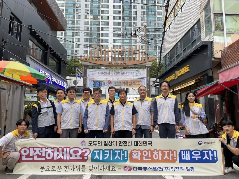 동서발전은 대국민 안전문화 슬로건 ‘지키자! 확인하자! 배우자!’에 따른 11개 실천과제가 담긴 소책자를 시민과 상인 200여 명에게 나눠주며 생활 속 안전실천을 강조했다. 안전을 지키는 행동요령은 △우회전 시 일단멈춤 지키자! △개인 이동장치 이용 시 안전수칙 지키자! △비상구·비상계단 적치물 치우고 확인하자! △차량 탑승 전 음주운전 여부 확인하자! △심폐소생술 배우자! △화재 대피요령 배우자! 등으로 안전의식 일상화를 위한 예방 수칙이다.