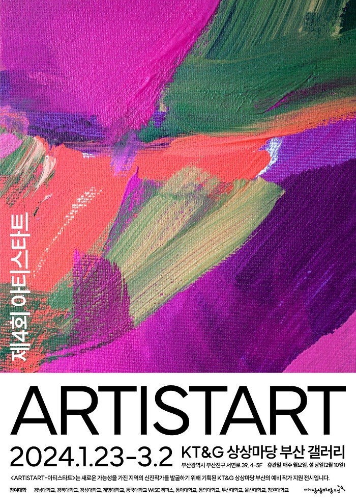 KT&G 상상마당 부산 관계자는 “ARTISTART를 통해 지역 예비 작가들의 참신한 작품을 지속적으로 소개하고 장르와 세대를 아우르는 문화예술 플랫폼으로 발전시켜 나가겠다”며, “앞으로도 청년 아티스트들이 활발한 예술 활동을 펼칠 수 있도록 아낌없는 지원을 이어나갈 것”이라고 밝혔다.