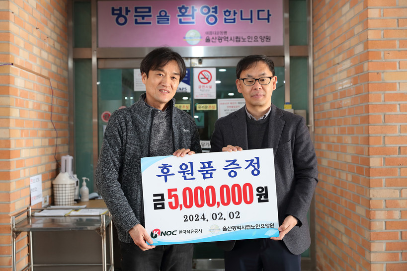 | ▲ 한국석유공사 정을래 상생협력팀장(오른쪽)이 설 명절을 앞두고 울산광역시립요양원 최대룡 시설장에게 성금을 전달했다. (사진=한국석유공사) |