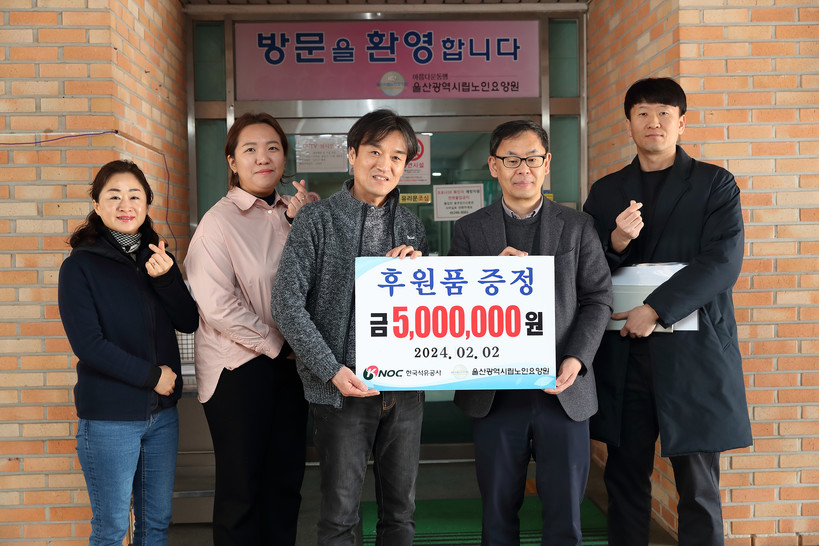 | ▲ 한국석유공사 정을래 상생협력팀장(왼쪽에서 네번째)이 설 명절을 앞두고 울산광역시립요양원 최대룡 시설장에게 성금을 전달했다. (사진=한국석유공사) |