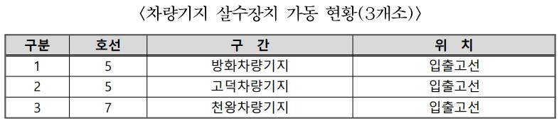| ▲ 차량기지 살수장치 가동 현황(3개소) (표=서울교통공사) |