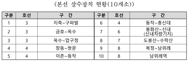 | ▲ 본선 살수장치 현황(10개소) (표=서울교통공사) |