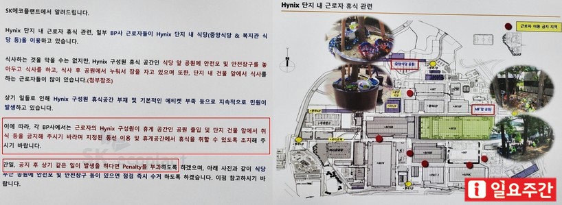 ▲지난 13일 SK에코플랜트가 경기도 이천 SK하이닉스 단지 내에서 근무 중인 건설 노동자들에게 공원 사용 등을 규정토록 한 공문(왼)과 단지 내 사용 가능 및 불가능한 지역을 설명한 그림(오). <사진=제보자>