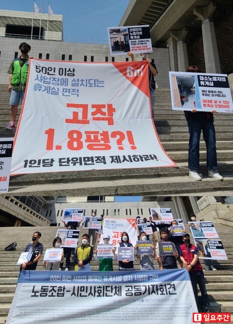 [일요주간 = 성지온 기자] 오는 8월 18일부터 산업안전보건법 제128조의 2(휴게시설의 설치) 개정에 따라 모든 사업장 내 휴게실 설치가 의무화됐다. 그러나 고용노동부가 입법예고 시행령을 통해 50인 미만 사업장, 50억원 미만 공사는 1년 적용 유예하면서 개정 법률 적용 대상은 전체 사업장의 ‘1.8%’로 줄었다. 이에 노동계와 시민사회단체는 쉴 권리에 차별이 있어서는 안 된다며 반발하고 나섰다. 특히, 휴게공간 면적과 관련해 머릿수와 관계없이 최소기준만 제시한 것을 두고 ‘비정상적’이라고 비난한 바 있다. 실제로 경기도 이천에 있는 반도체 공장 건설현장에서는 인원수 대비 부족한 휴게시설로 내부 잡음이 새기도 했다.