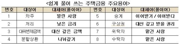 HF공사는 앞으로 ‘차주’나 ‘저리’ 등과 같이 한자어로 표현된 용어는 ‘빌린 사람’, ‘낮은 금리’ 등으로 바꾸고 ‘분할상환’이나 ‘대위변제금액’ 등과 같이 자주 사용하는 주택금융용어는 ‘나눠갚기’, ‘대신 갚은 금액’ 등으로 쉽게 풀어서 사용할 예정이다.