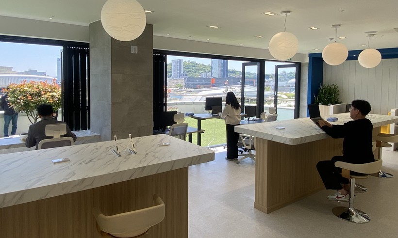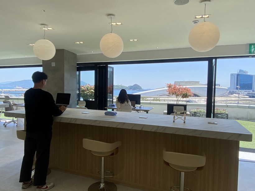 여수시 엑스포컨벤션센터에 위치한 블루워케이션센터는 약 175㎡(53평) 규모로 한꺼번에 20여 명을 수용할 수 있다. 사무 공간(공유오피스·소회의실)과 휴게공간(1인 폰부스·차 준비실)을 갖추고, 탁 트인 바다 전망이 돋보이도록 구성했다.