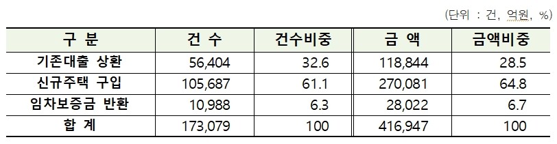 자금용도별로는 기존대출 상환이 28.5%, 신규주택 구입이 64.8%, 임차보증금 반환이 6.7% 비중을 차지하였다.