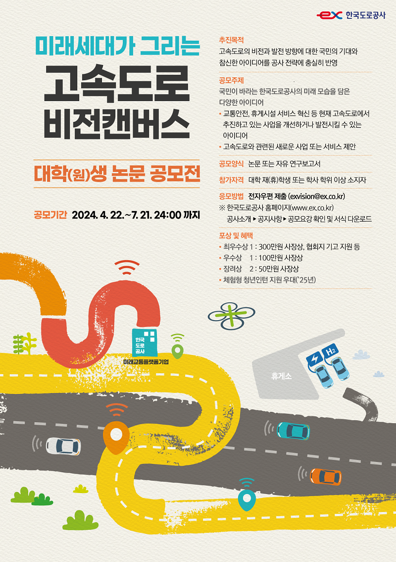 이번 공모전은 대학생 및 학사 학위 이상 소지자이면 누구나 참여할 수 있으며, 한국도로공사 홈페이지(https://www.ex.co.kr)에서 응모 서식을 내려받아 작성한 후, 이메일(exvision@ex.co.kr)로 제출하면 된다.