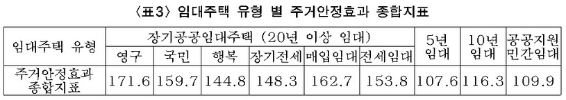 발제에 따르면 주거안정 효과는 영구임대, 국민임대, 매입임대 등 장기·저렴 임대주택일수록 높게 나타났으며, 공공임대주택이더라도 5년 임대, 10년 임대는 공공지원민간임대주택과 비슷한 수준의 주거안정 효과를 보였다.