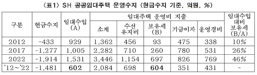 지난해 기준 SH공사가 납부한 보유세(697억 원)의 66%는 공공임대주택 분으로, 임대수입의 46%에 달했다. 반면 지난해 SH공사 공공임대주택 임대수입은 1,531억 원으로, 사업 운영에 필수적으로 필요한 기금이자(826억 원)와 운영경비(769억 원), 수선유지비(1,154억 원)에도 미치지 못한다. 이 같은 상황에서 과도한 보유세(697억 원)는 공공임대주택 사업 적자를 키우고 사업의 지속 가능성을 저해하는 주요 원인이 되고 있다.