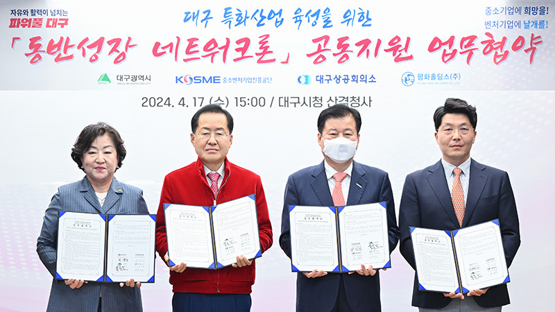 [일요주간=김영란 기자] 대구광역시와 중소벤처기업진흥공단(이하 중진공), 대구상공회의소 및 평화홀딩스(주)는 4월 17일(수) 오후 3시 대구광역시 산격청사에서 전국 최초로 ‘특화산업 육성을 위한 동반성장 네트워크론 공동지원 업무협약’을 체결했다.