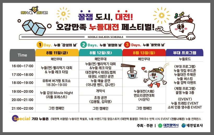 '잇다 누들, 잼 있다 대전'이라는 주제로 소문난 누들존, 누들의 부엌존, 추억의 누들존, 누들로드존 등 4개 행사존을 마련했고 다양한 이벤트를 선보일 예정이다.