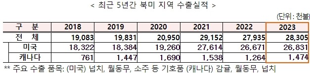 한편, 최근 북미지역으로의 수출량은 지속적으로 증가하는 추세다. 미국시장은 북미시장의 95%를 차지하고 있으며 케이(K)-컬쳐의 인기로 소주 등 기호품 판매량이 증가하고 있다.