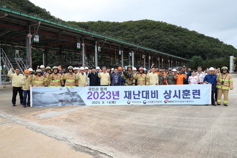 | ▲ 한국석유공사 재난대비 상시훈련을 마치고 참가자들이 기념촬영을 하고있다.(사진=석유공사) |