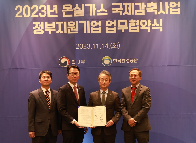 한국서부발전은 11월 14일(화) 서울 코트야드 메리어트 호텔에서 한국환경공단과 ‘2023년 온실가스 국제감축사업’ 지원을 위한 업무협약을 체결했다. 이번 협약식에는 한국서부발전을 비롯해 지원사업에 선정된 25개 기업관계자들이 참석했다.