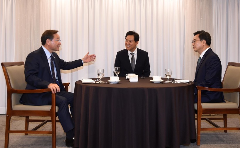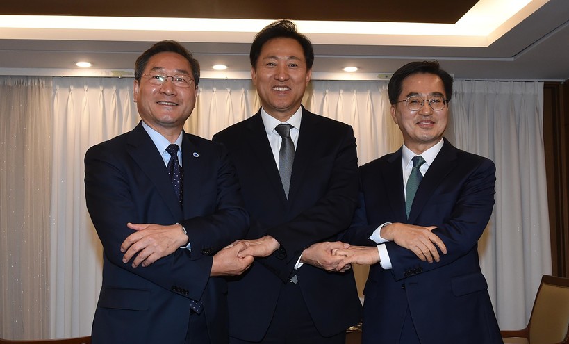 ▲ 유정복 인천광역시장이 2023년 11월 서울 프레스센터에서 오세훈 서울시장, 김동연 깅기도지사와 회동하고 있다.(사진=인천시) |