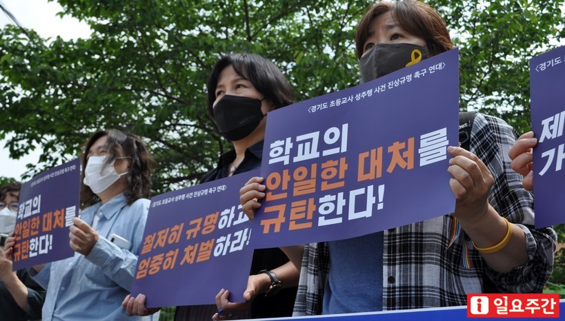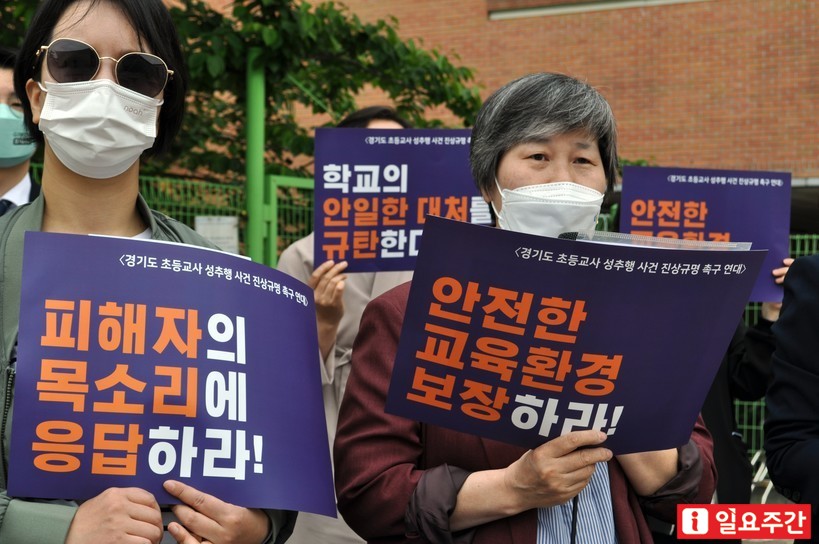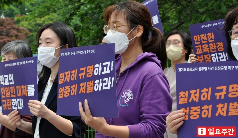 여성·시민사회단체로 구성된 ‘경기도 초등교사 성추행 진상규명 촉구 연대’는 지난 13일 수원시 경기도교육청 남부청사 앞에서 기자회견을 열고 해당 학교와 교육청에 진상규명 및 가해교사 처벌을 촉구했다.