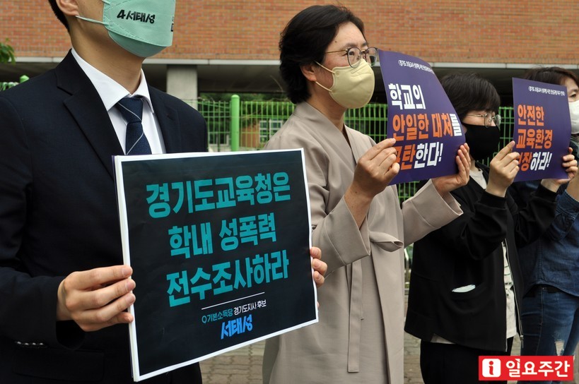 | ▲ ‘경기도 초등교사 성추행 진상규명 촉구 연대’가 지난 13일 수원시 경기도교육청 남부청사 앞에서 기자회견을 열고 제자를 성추행한 가해교사에 대한 처벌과 성추행 사건 진상 규명을 촉구했다. <사진=성지온 기자> |