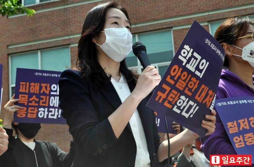 | ▲공익인권법재단 공감의 김지혜 변호사는 지난 13일 경기도 수원시 경기도교육청 남부청사 앞에서 열린 경기도 초등교사 성추행 진상규명 촉구 기자회견에 참석했다. <사진=성지온 기자> |