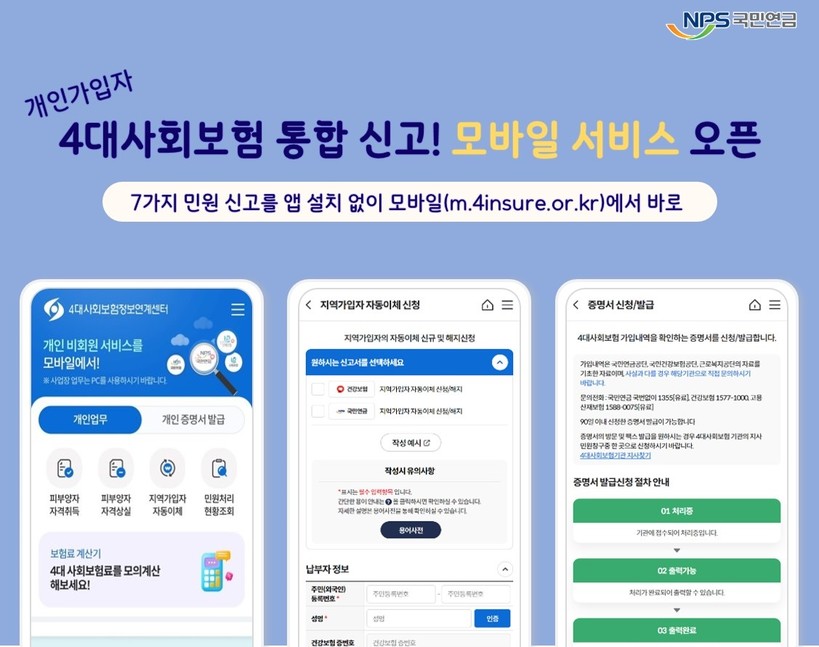 [일요주간=김영란 기자] 국민연금공단(이사장 김태현)은 4대사회보험정보연계센터 누리집에서만 할 수 있었던 전자민원 신고·신청을 모바일에서도 할 수 있도록 개선했다고 23일 밝혔다.