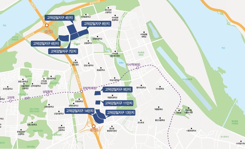고덕강일지구는 강일·미사지구와 연계되는 우수한 입지조건과 6,000여 세대 대단지 배후수요를 가지고 있다.