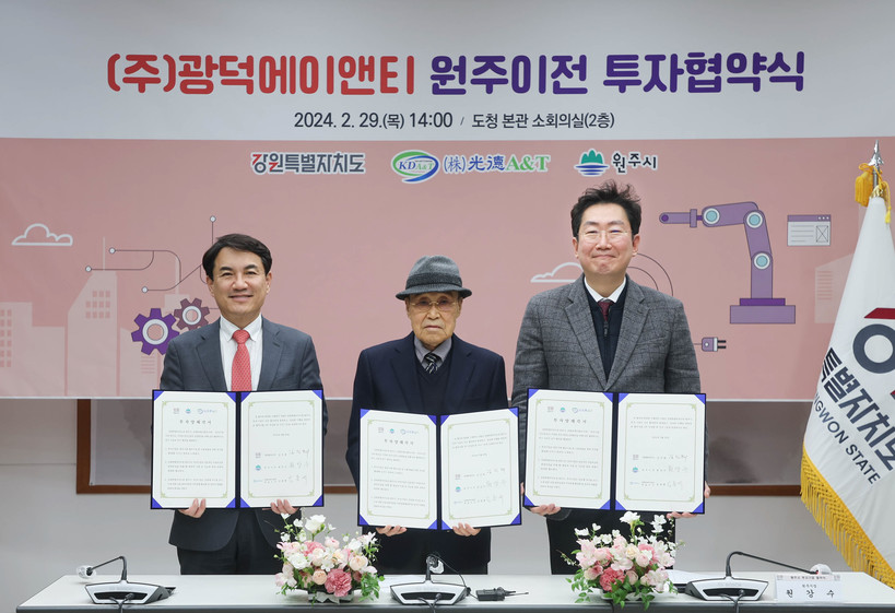 [일요주간=김영란 기자] 강원특별자치도가 원주시, (주)광덕에이앤티와 함께 2월 29일 도청 본관 소회의실에서 투자협약식을 체결하였다.