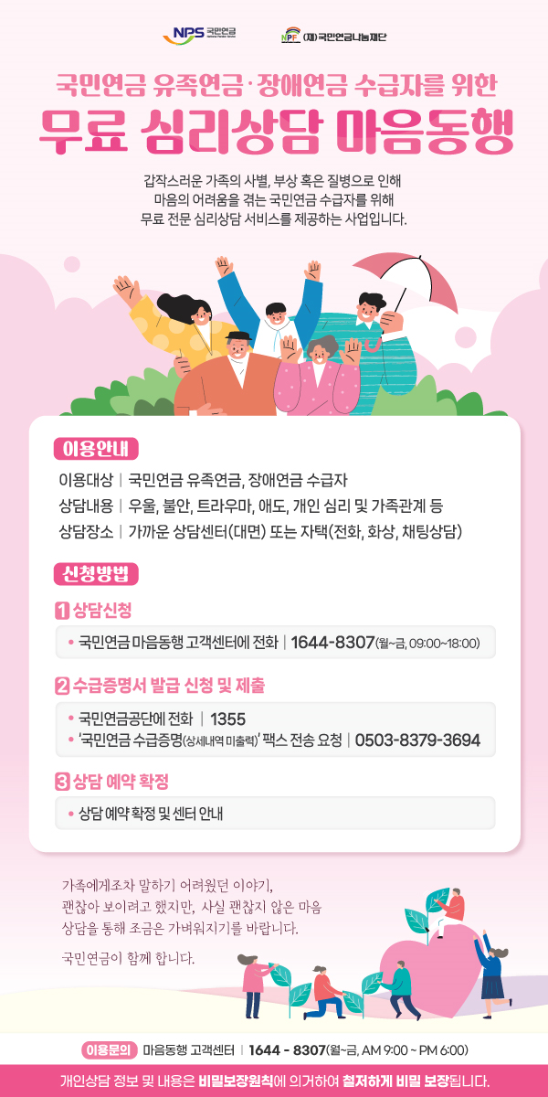 2024년 상담을 희망하는 유족연금·장애연금 수급자는 ‘국민연금 마음동행 고객센터(1644-8307)’로 전화해 전국에 있는 심리상담센터 중 원하는 상담센터를 골라 상담 날짜와 시간을 예약하고 방문하면 된다. 방문이 어려운 분은 전화·화상·채팅 등 비대면 상담도 가능하다.