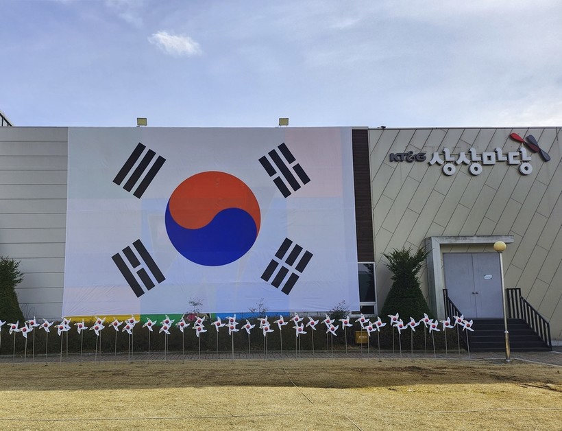 ▲ KT&G(사장 백복인)가 삼일절을 앞두고 애국지사들의 희생정신을 기리고 독립운동의 의미를 되새기기 위해 지난 28일 국립대전현충원에서 독립유공자 묘역정화 활동을 실시하고 상상마당에서 태극기 설치 캠페인을 진행했다. 사진은 KT&G 상상마당 논산에 대형 태극기 현수막과 태극기 바람개비 조형물이 설치된 모습(사진=KT&G) |