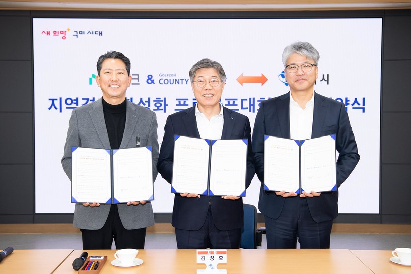 [일요주간=최부건 기자] 구미시는 31일 시청 대회의실에서 황병우 iM뱅크 은행장, 서상현 골프존카운티 선산 대표이사와 함께 지역경제 활성화를 위한 프로골프대회 유치 협약식을 가졌다.