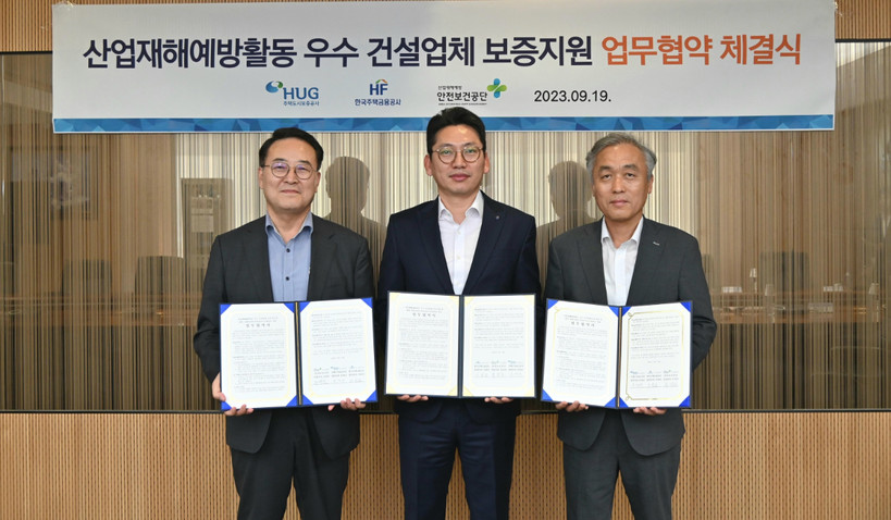 [일요주간=김영란 기자] 한국주택금융공사(HF,사장최준우)는 주택도시보증공사(HUG, 사장 유병태), 한국산업안전보건공단(KOSHA,이사장 안종주)과 ‘안전관리 우수기업에 대한 금융지원 업무협약’을 체결했다고 19일 밝혔다.