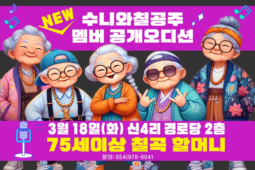 ▲ “수니와칠공주 새 멤버 공개 오디션 포스터. 75세 이상 칠곡 할머니, 3월 18일(화) 신4리 경로당 2층에서 도전하세요! (사진=칠곡군청)