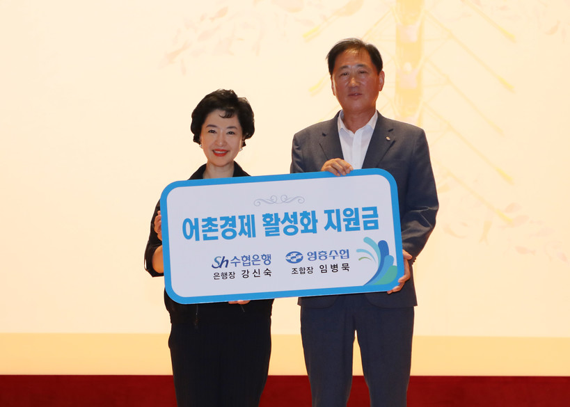 | ▲ Sh수협은행 강신숙 은행장은 지난 28일, 인천 옹진군 영흥도에서 개최한 ‘2023년 하반기 수협은행 경영전략회의’에서 본 행사에 앞서 영흥수협 임병묵 조합장에게 어촌경제활성화 지원금을 전달하고 “영흥도를 비롯해 최근 수산물 소비감소로 어려움을 겪고 있는 전국의 수산‧어업인에 대한 지속적인 지원에 최선을 다할 것”이라고 말했다. (사진=수협은행) |