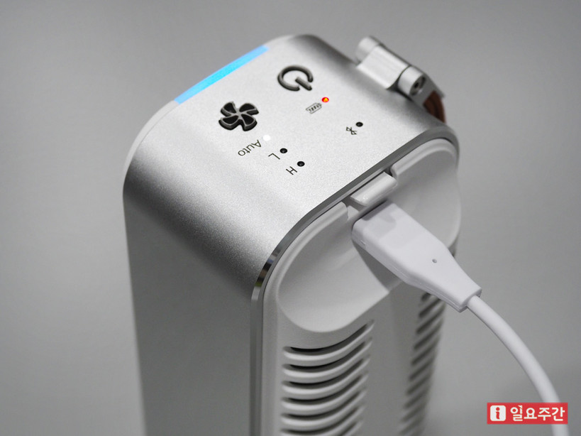 USB-C 연결 케이블로 충전 후 집진필터를 후면에 장착하고 작동시켜보니 사무실의 기본 소음에 묻혀 전혀 소리를 들을 수 없을만큼 조용했다. 미니 공기청정기는 30dB의 도서관과 비슷한 저소음으로 보다 쾌적하게 사용 가능하며, 자동 모드로 설정해두면 조용하게 작동하다가 먼지와 미세먼지 등의 오염 물질이 감지되면 세게 돈다.