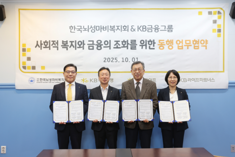[일요주간 = 김완재 기자] KB국민은행(은행장 이환주)은 지난 1일 한국뇌성마비복지회, KB라이프생명, KB라이프파트너스와 함께 장애 가정의 금융 선택권 확대와 금융복지 강화를 위한 업무협약(MOU)을 체결했다고 밝혔다.