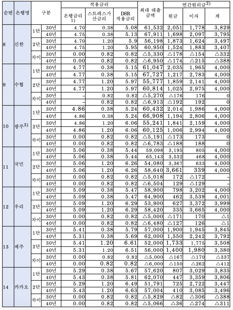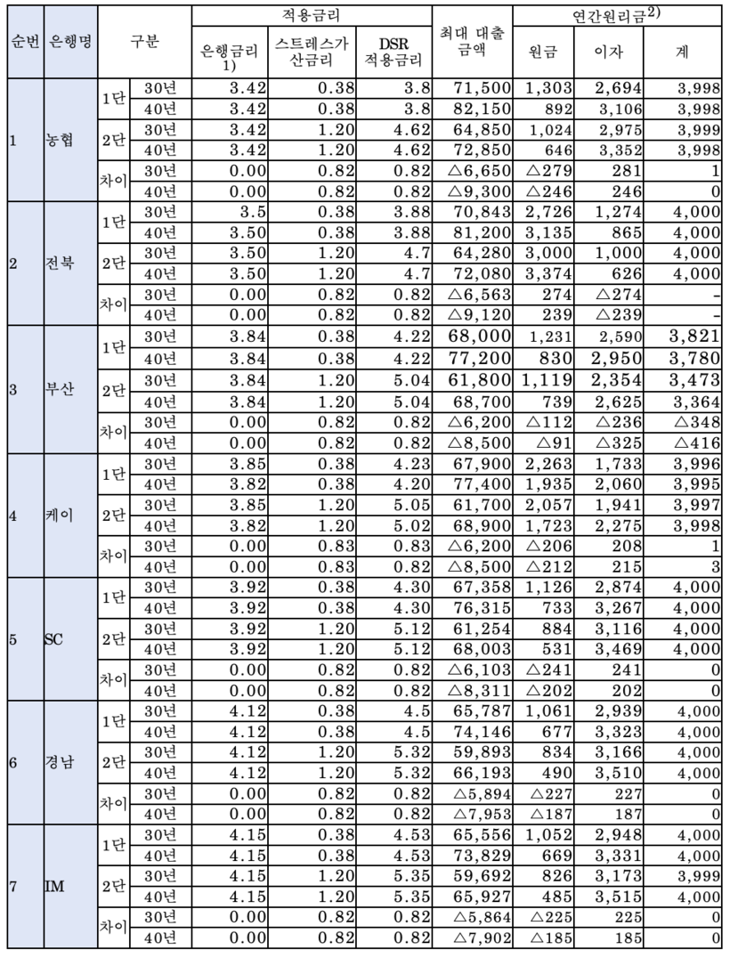 40년 만기 시 역시 △농협은행의 최대 대출금액 감소 폭이 9300만 원으로 가장 컸다. 다음으로 △전북은행 9120만 원, △부산과 K은행이 8500만 원, △SC은행 8311만 원, △경남은행 7953만 원 등의 순이다.