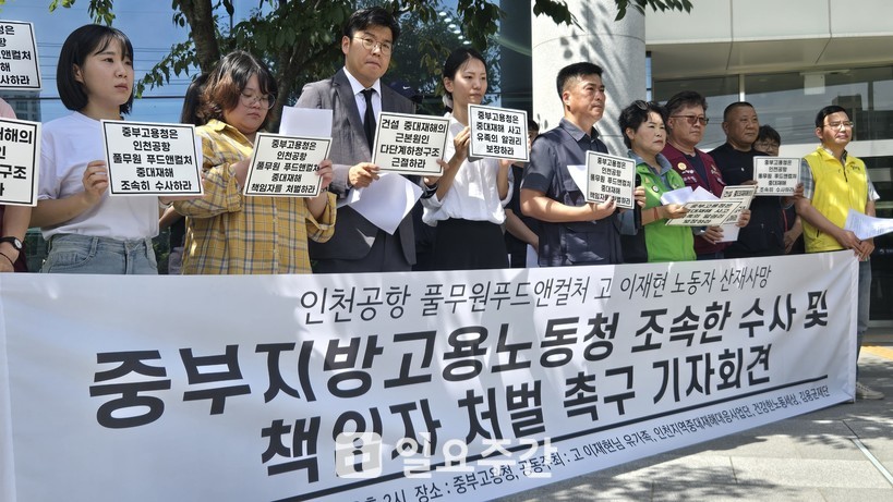 유가족과 노동단체, 지난 26일 중부지방고용노동청 앞에서 기자회견 개최 "조속한 수사와 책임자 처벌" 촉구