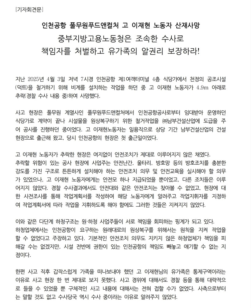 지난 4월 3일, 인천국제공항 제2여객터미널 4층 식당가에서 일용직 노동자 이재현 씨가 공사용 비계를 설치하던 중 6m 아래로 떨어져 병원으로 이송됐으나 같은 날 사망했다. 사고 현장은 ㈜풀무원푸드앤컬처(대표 이동훈)가 운영하는 식당가로, 시공은 ㈜남부건설산업(대표 이정남)이 맡았다. 고인은 남부건설산업 소속 일용직 노동자로, 사고 당시 시설 철거 및 원상복구 작업에 투입됐다.