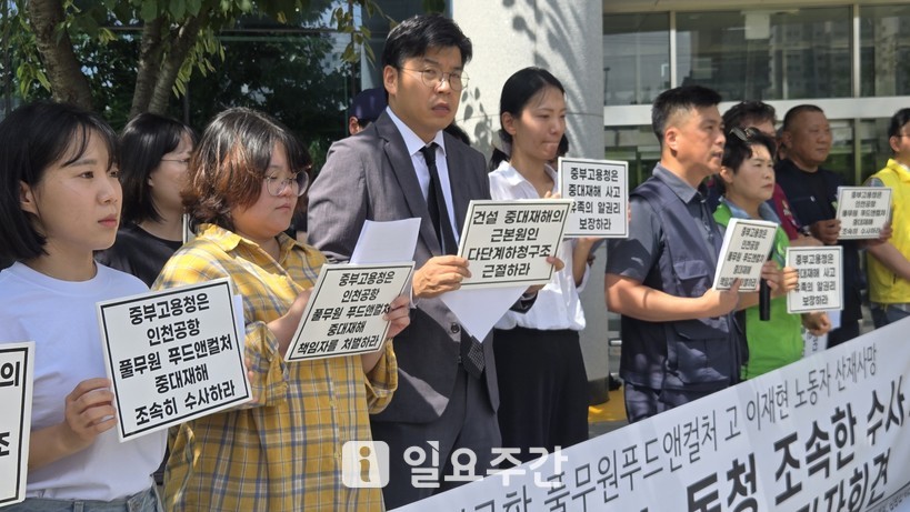 이들 단체는 기자회견문을 통해 △인천공항 풀무원푸드앤컬처 중대재해 조속한 수사, 책임자 처벌, 유가족의 알 권리 보장, 건설업 다단계 하청구조 근절 등의 요구 조건을 제시했다.