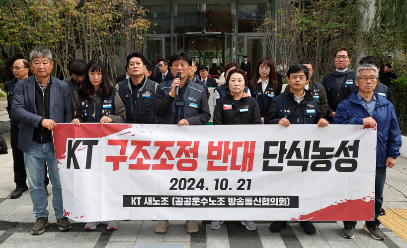 ▲ KT 새노조 조합원들이 지난해 10월 21일 서울 종로구 KT 광화문 빌딩 앞에서 구조조정 반대 단식농성 기자회견을 하고 있다. (사진=newsis) |