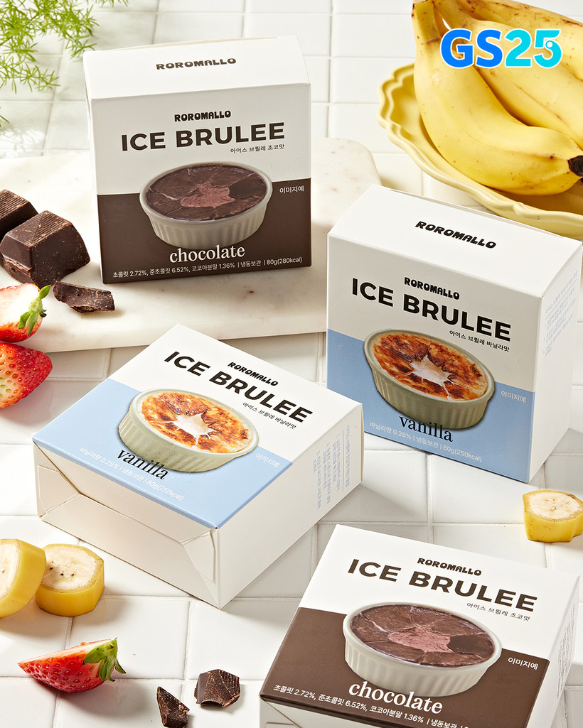 GS25에서 출시한 로로멜로 아이스브륄레 바닐라는 진하고 시원한 크림 위에 화이트 초콜릿을 올린 뒤, 캐러멜 라이징 한 설탕으로 마무리해 겉은 바삭하고 속은 부드러운 조합이 특징이다.