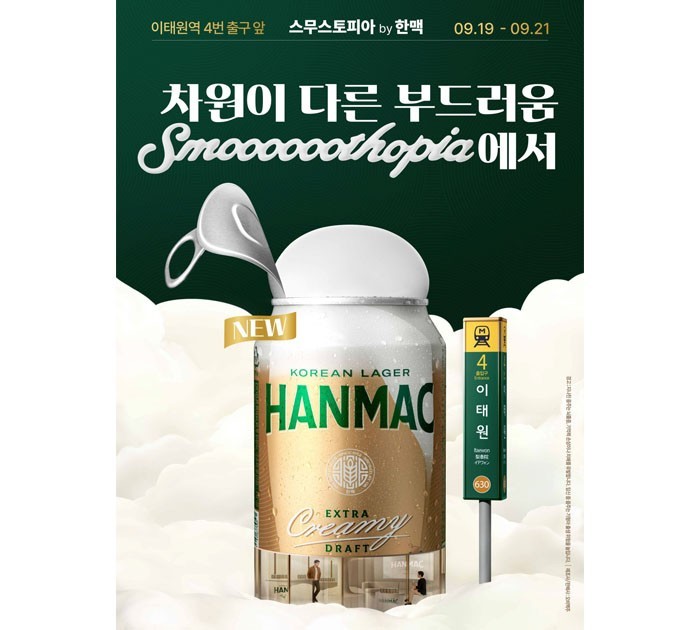 한맥은 팝업스토어 외에도 도심 속 옥외광고를 통해 브랜드 경험을 확장한다. 팝업이 시작되는 19일부터 이달 말까지 이태원역 삼거리 인근 건물 2곳의 대형 전광판에서는 3D 아나모픽(anamorphic, 착시현상을 통해 입체감을 구현하는 영상 기법) 기술을 활용한 광고가 송출된다. ‘SMOOOOOOTH’라는 문구와 함께 입체적으로 구현된 거품이 화면에 나타나며, 팝업에서의 경험을 시각적으로 이어간다.