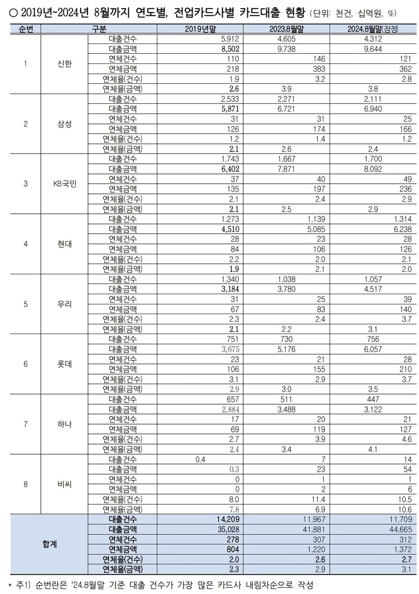국회 정무위원회 소속 국민의힘 강민국 의원실에서 금융감독원에 자료요구를 통해 받은 답변자료인 '국내 카드 대출 및 연체 현황'을 살펴보면 2024년 8월 말 현재 카드 대출금액은 총 44조 6650억 원(1170만 9000건) 이나 됐다. 이는 금융감독원이 통계를 추산한 지난 2003년 이후 가장 많은 대출 규모이다.
