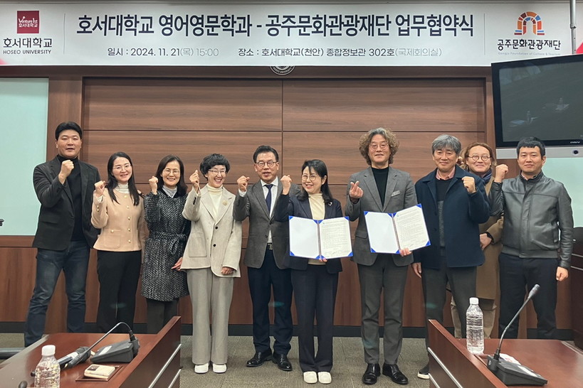 [일요주간 = 이수근 기자] 호서대학교(총장 강일구)는 영어영문학과가 지난 21일 천안캠퍼스 국제회의실에서 공주문화관광재단과 ‘우수 인재 양성과 취업 지원’을 위한 업무협약(MOU)을 체결했다고 밝혔다.