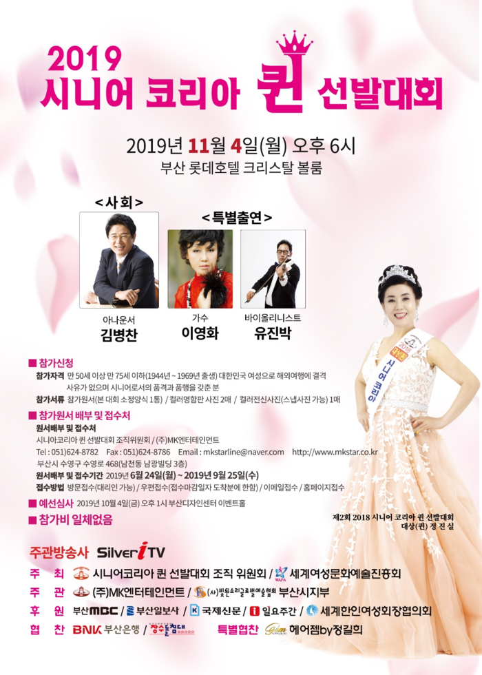 원서배부 및 접수처는 시니어코리아 퀸 선발대회/(주)MK엔터테인먼트, 부산광역시 수영구 수영로 468(남천동 남광빌딩3층)이다.