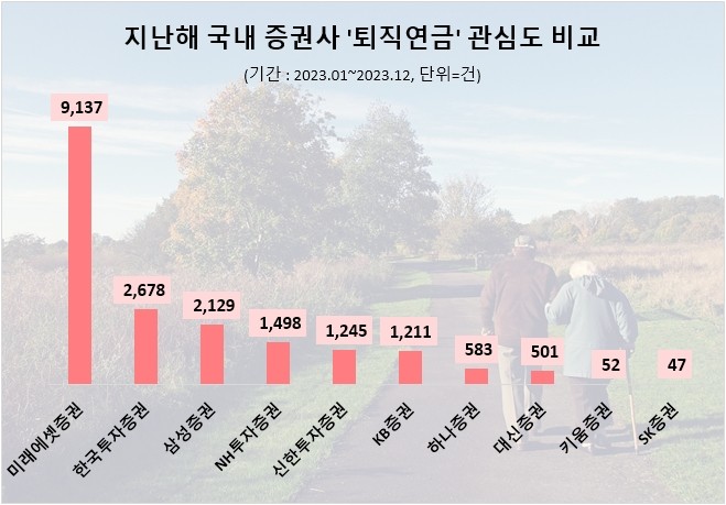 [일요주간 = 김완재 기자] 데이터앤리서치가 지난해 주요 증권사 10곳을 대상으로 '퇴직연금' 관련 포스팅 수를 조사한 결과 자금력이 가장 탄탄한 '미래에셋증권'이 가장 높은 것으로 나타났다.