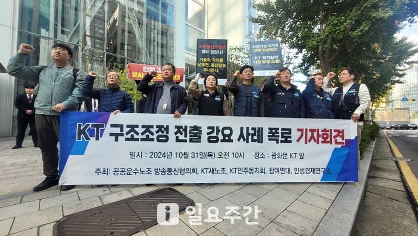 ▲ 지난달 31일 서울 광화문 East빌딩 앞에서 열린 'KT 구조조정 전출 강요 사례 폭로 기자회견' 모습. 공공운수노조 등은 KT 김영섭 사장과 안창용 부사장의 전출 강요행위에 대한 즉각 사과 및 중단을 촉구했다. (사진=공공운수노조 제공) |
