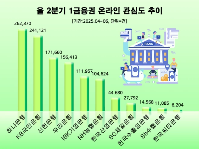 [일요주간 = 김완재 기자] 하나은행이 올해 2분기 1금융권 온라인 관심도 조사에서 26만여 건의 포스팅으로 1위를 차지했다.