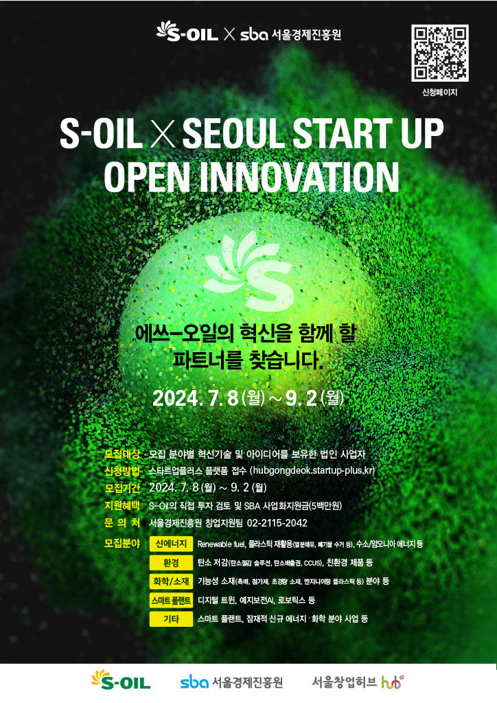 S-OIL은 서울창업허브와 공동으로 스타트업 협업 프로그램(2024 S-OIL X Seoul Startup Meet-up)에 참여할 혁신기술 스타트업을 선발한다고 8일 밝혔다.