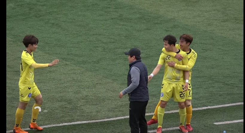 | ▲ 2018년 7월 15일, 제가 코치로 있던 칼빈대 선수들이 골을 넣고 극적으로 한양대랑 무승부하다. |
