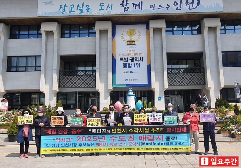[일요주간 = 김성환 기자] 환경단체 글로벌에코넷과 인천 환경운동연합서구지회 등 시민단체가 인천시장 후보들의 수도권매립지 종료 선거 공약서 발표를 촉구하고 나섰다.